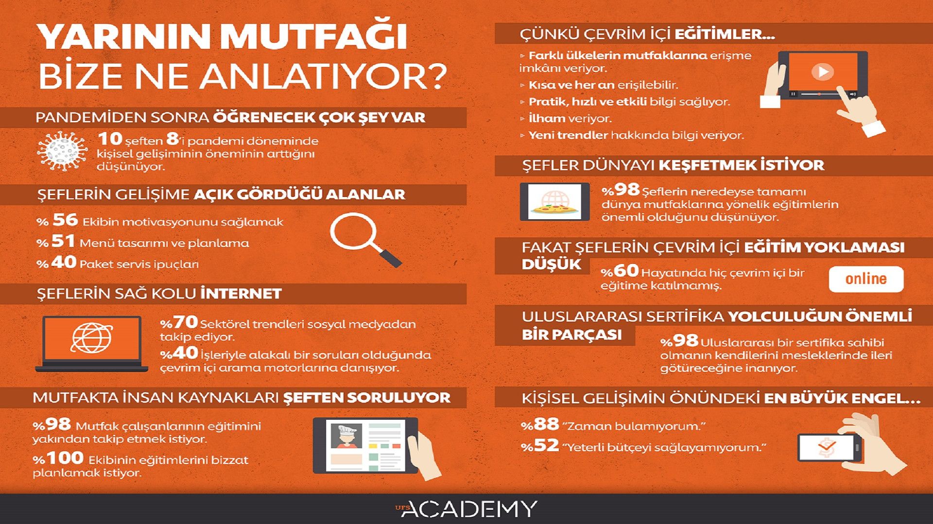 Unilever Ev Dışı Tüketim’in Türkiye’de şeflerle gerçekleştirdiği araştırma şeflerin eğitim ve profesyonel gelişim alışkanlıkları ve ihtiyaçlarına ışık tutuyor. Araştırma şeflerin büyük bir çoğunluğunun profesyonel gelişim, trendleri takip etmek ve işleriyle ilgili konularda danışmak için çevrim içi kaynaklara başvurduğunu gösteriyor. Şefler çevrim içi eğitimlerin gelişimleri için önemli olduğunu düşünüyor. Ancak şeflere çevrim içi eğitimlere katılım durumları sorulduğunda şeflerin yüzde 60’ının hayatında hiç çevrim içi bir eğitime katılmadığı ortaya çıkıyor.
